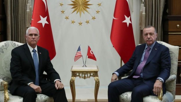 بعد مفاوضات استغرقت أكثر من أربع ساعات بين نائب الرئيس الأمريكي مايك بنس والرئيس التركي رجب طيب أردوغان يوم 17 اكتوبر/ تشرين الأول الحالي أصدر الجانبان البيان التالي الذي يحمل اسم "البيان الأمريكي-التركي المشترك حول شمال شرق سوريا":